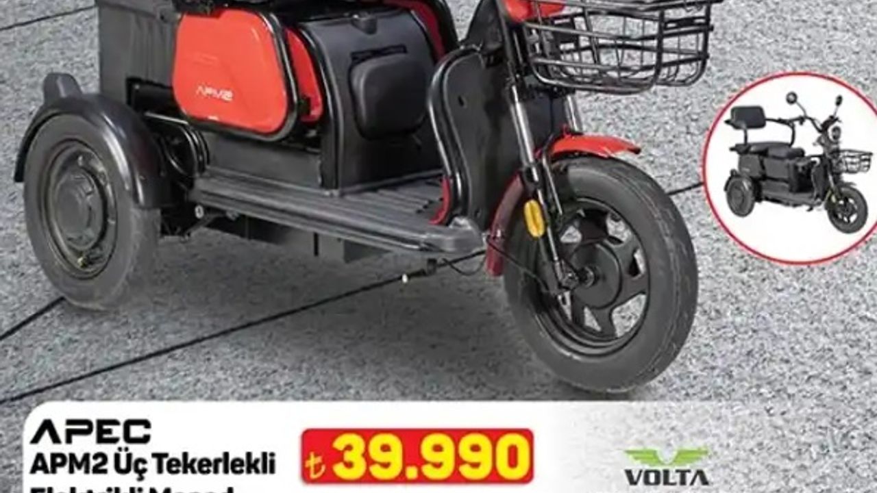 A101’den elektrikli ulaşım meraklılarına özel bir fırsat! 11 Aralık’ta mağazalarda satışa sunulacak APEC APM2 üç tekerlekli elektrikli moped, 39.990 TL peşin fiyatıyla ve 6 taksit seçeneğiyle kullanıcılarıyla buluşuyor.