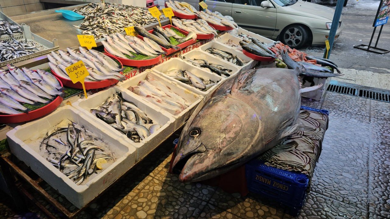 Dev orkinos, hem büyüklüğü hem de yolculuğuyla Erzincan’da balık tezgâhlarının alışılmış görüntüsünün dışına çıkarak vatandaşların ilgi odağı oldu.