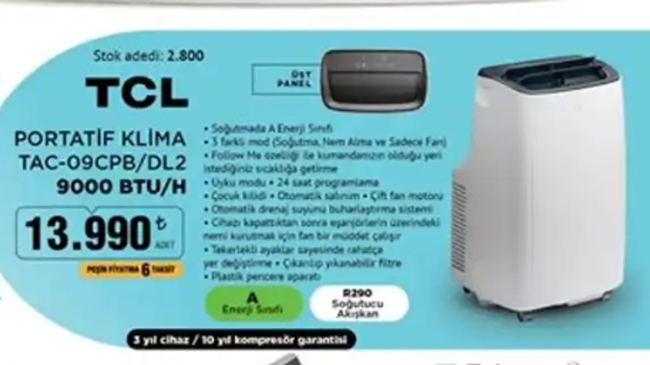 Ayrıca cihazda yer alan çocuk kilidi, aileler için ekstra güvenlik sunarken, özellikle küçük çocuklu evlerde gönül rahatlığıyla kullanılabiliyor. BİM, bu kullanışlı klimayı peşin fiyatına 6 taksit imkânıyla satışa sunarak hem bütçeyi hem de yaz konforunu düşünen tüketicilere hitap ediyor.
