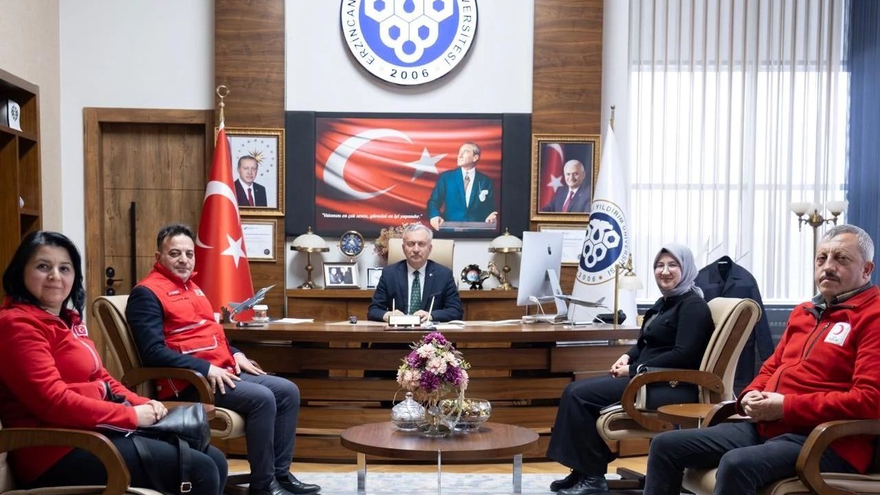 Türk Kızılay Erzincan İl Merkezi Başkanı Dr. Öğr. Üyesi Bülent Yavuzer, Erzincan Kan Merkezi Müdürü Dr. Nazmiye Merve Özdemir, Genç Kızılay Erzincan Teşkilat Başkanı Fatmanur Acar ve kan bağışı çalışanlarından oluşan heyet, Erzincan Binali Yıldırım Üniversitesi Rektörü Prof. Dr. Akın Levent’i makamında ziyaret etti.