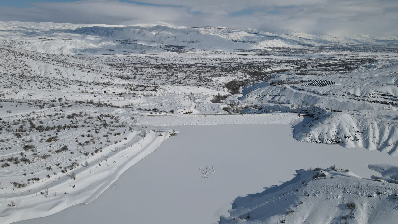 Kış mevsiminin sert yüzünü gösterdiği Erzincan’da, beyaz örtüyle kaplanan baraj ve çevresi kartpostallık görüntüler oluştururken, ortaya çıkan manzara dronla havadan görüntülendi. Görüntüler, soğuk havanın bölgedeki etkisini gözler önüne serdi.