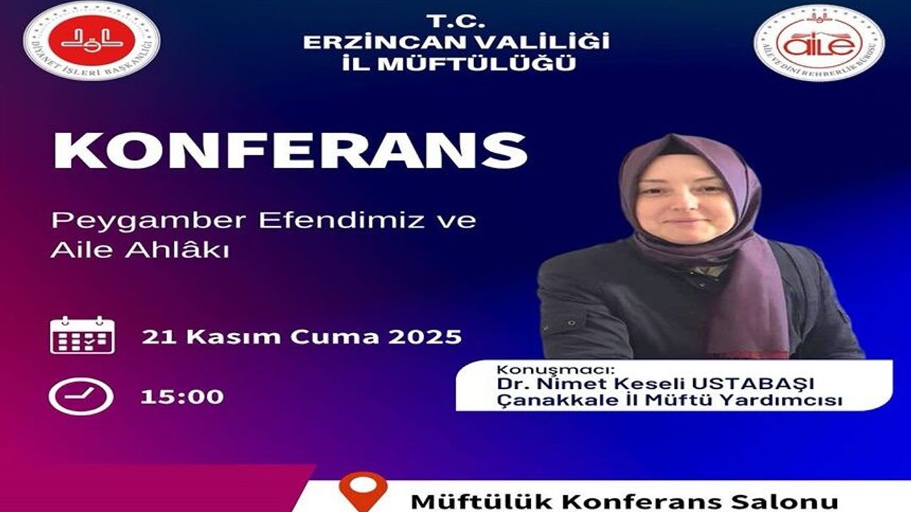 Erzincan’da önemli bir konferans düzenleniyor. “Peygamber Efendimiz ve Aile Ahlakı” konulu konferans, 21 Kasım 2025 Perşembe günü saat 15:00’te Erzincan Müftülüğü Konferans Salonu’nda gerçekleştirilecek.