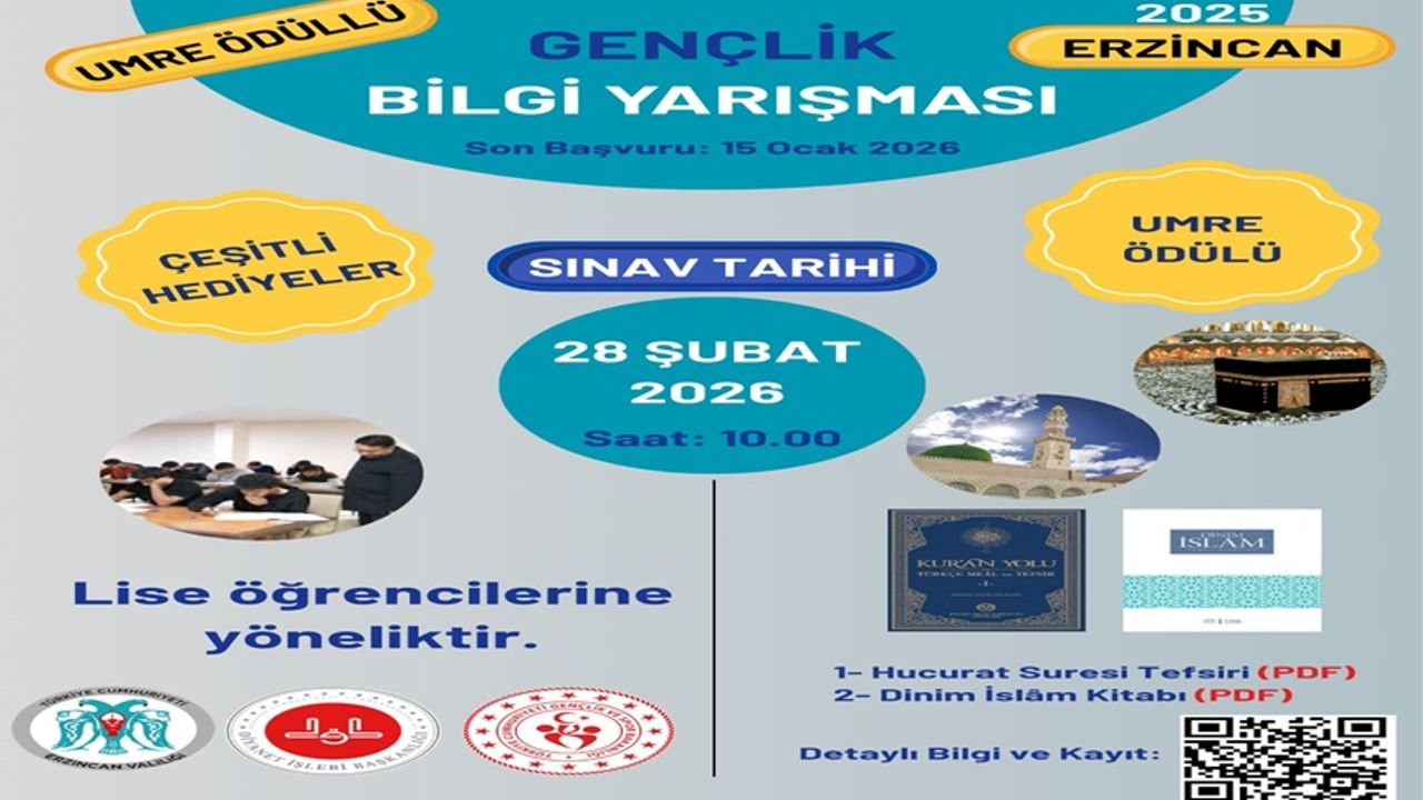 Erzincan’da liseli öğrencilerin katılımına açık Umre Ödüllü Gençlik Bilgi Yarışması için başvurular başladı. Öğrencilerin dini bilgi düzeylerini geliştirmeyi ve gençleri manevi yönden desteklemeyi amaçlayan yarışmanın sınavı 28 Şubat saat 10.00’da gerçekleştirilecek.