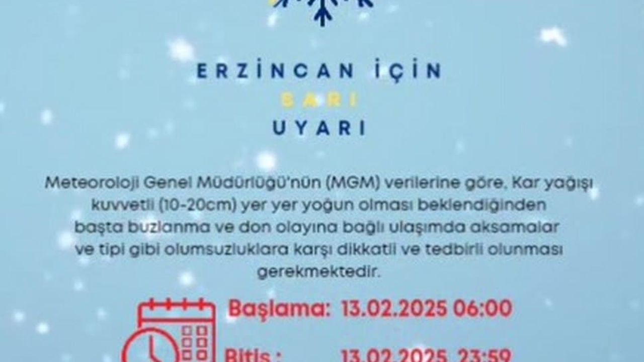 Meteoroloji Genel Müdürlüğü'nün verilerine göre, Erzincan'da kar yağışı 13 Şubat Perşembe günü saat 06:00'da başlayacak ve 23:59'a kadar devam edecek. Bu süre zarfında, buzlanma ve don olaylarına karşı dikkatli olmak gerekiyor.