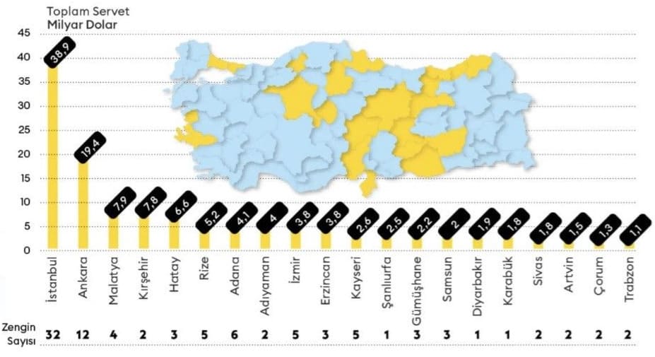 Listenin illere göre dağılımında, Türkiye'nin finans başkenti İstanbul, 38,9 milyar dolarlık toplam servetle zirvede yer aldı. 32 zenginin yaşadığı İstanbul'u, 19,4 milyar dolarlık servetle Ankara takip etti. Ancak dikkat çeken sürprizlerden biri, listede 3 zenginin yaşadığı Erzincan'ın toplam 3,8 milyar dolarlık servetiyle 10. sırada yer alması oldu. Bu durum, Erzincan'ın listedeki birçok büyük şehri geride bırakması açısından dikkat çekici bir gelişme olarak değerlendirildi.