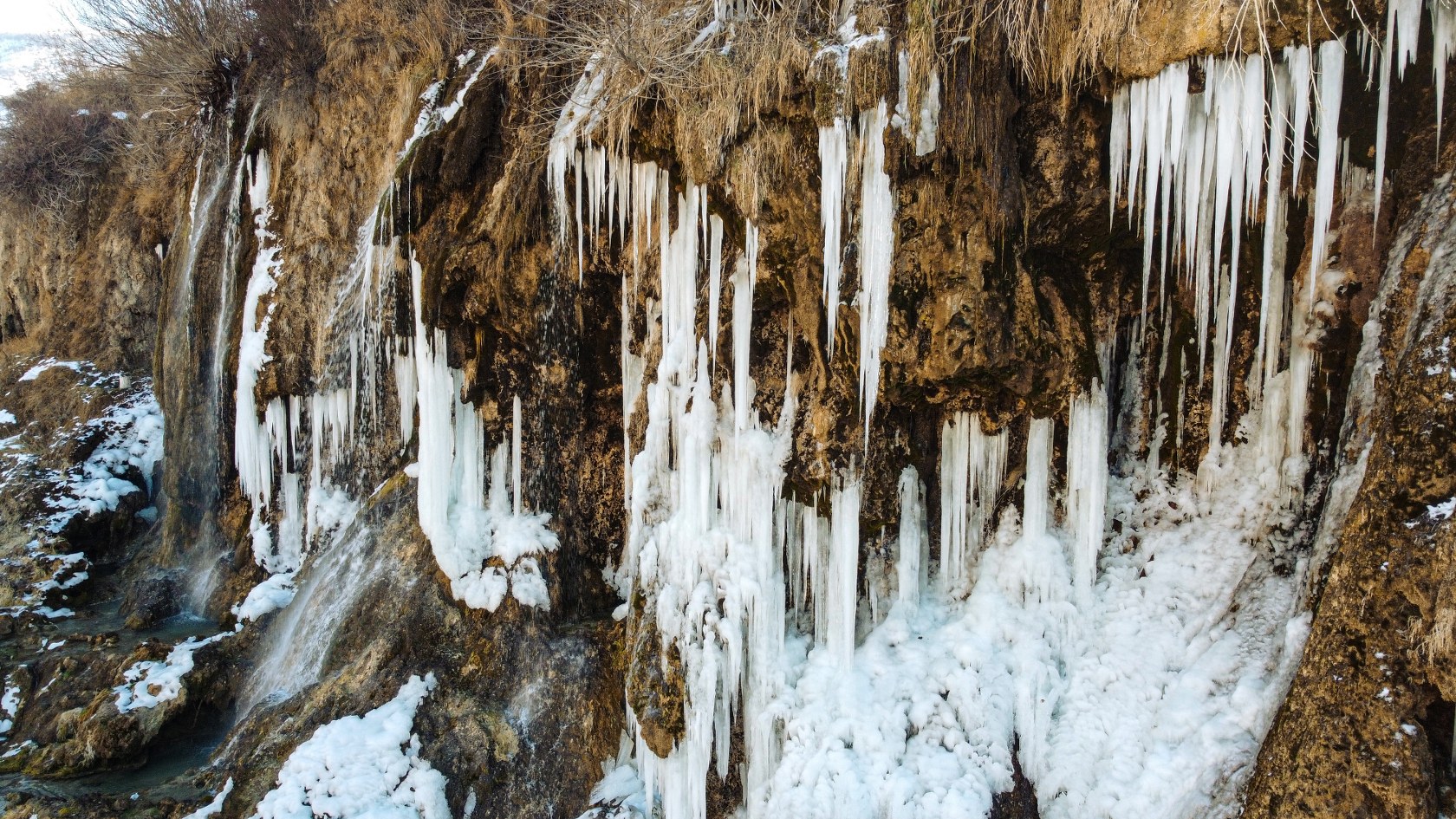 Erzincan'ın Çağlayan Beldesi'nde bulunan Girlevik Şelalesi'ndeki su soğuk hava sebebiyle buz tuttu. Güzel görüntülerin ortaya çıktığı Girlevik şelalesinin bu hali dikkat çekti.