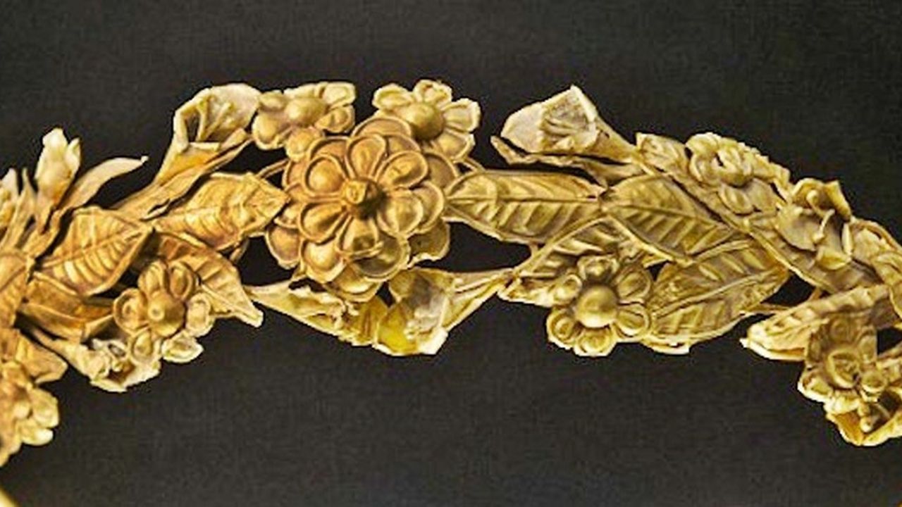 Mezar içeriğinde bulunan eserler adeta bir hazinenin kapılarını araladı. En dikkat çekici parçalar arasında, tanrı Dionysos’un mitolojik sahneleriyle süslenmiş iki altın taç ve iki altın çelenk yer alıyor. Ayrıca, arı figürlü altın bir yüzük, zafer tanrıçası Nike formunda yapılmış altın bir aplik, iki gümüş sikke, bronz bir ayna ve muhtemelen kemikten yapılmış flüt parçaları da bulundu.