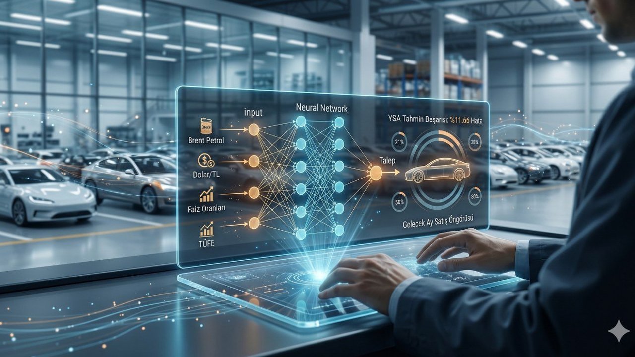 Günümüz dünyasında otomobil talebi; petrol fiyatlarından dolar kuruna, enflasyondan kredi faizlerine kadar onlarca farklı değişkenden etkileniyor. Geleneksel yöntemler bu karmaşık ilişkiyi çözmekte zorlanırken, bilimsel bir araştırma kapsamında kullanılan Yapay Sinir Ağları algoritması, tıpkı bir insan beyni gibi veriler arasındaki gizli örüntüleri öğreniyor.