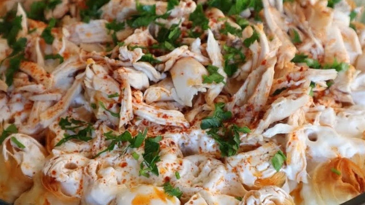 Fırından çıkardığınız yufkalar tamamen soğuduktan sonra üzerine haşlanan tavuk suyu ekleyin. Ardından sarımsaklı yoğurdu yufkaların üzerine sürün. Son olarak, didiklenmiş tavukları ekleyin ve üzerine hazırladığınız biberli sosu dökün. Maydanoz ile süsleyip sıcak sıcak servis yapın.