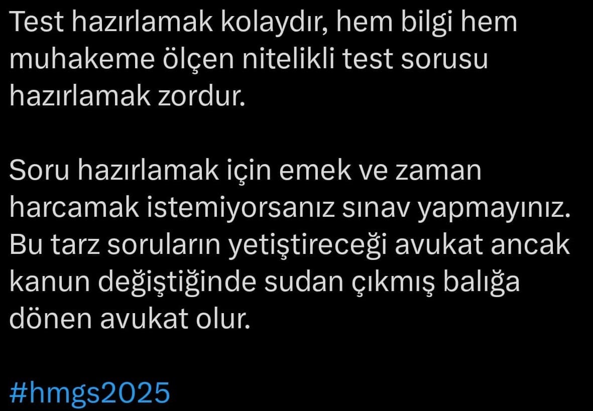 Sadece adaylar değil, hukuk alanında uzman isimler de sınav sorularının sıra dışı zorluğuna dikkat çekiyor. X üzerinden yapılan bazı yorumlarda, deneyimli avukatlar ve akademisyenler, sınav sorularının aşırı detaycı ve pratikten uzak olduğunu belirtiyorlar.