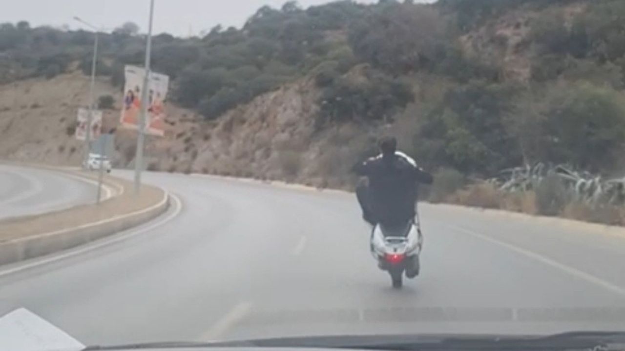 Muğla’nın Bodrum ilçesinde motosikletle tek teker üzerinde seyreden gencin tehlikeli yolculuğu, kameralara yansıdı.